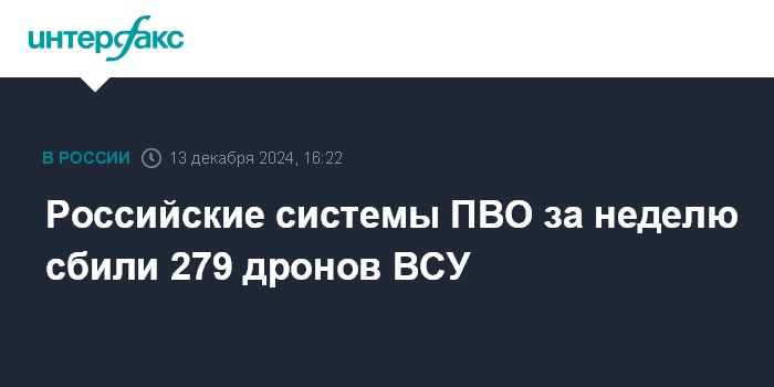 Москва. 13 декабря. INTERFAX.RU - Российские военные за неделю сбили 279 украинских беспилотников, а также уничтожили восемь безэкипажных катеров вооруженных сил Украины (ВСУ), заявили в Минобороны РФ в пятницу.