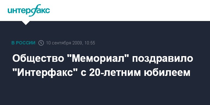 Москва. 10 сентября. INTERFAX.RU – Международное историко-просветительское и правозащитное общество "Мемориал" поздравило информационную группу "Интерфакс" с 20-летним юбилеем.