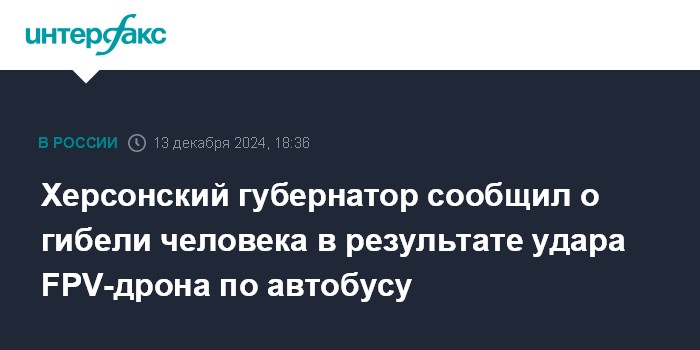 Москва. 13 декабря. INTERFAX.RU - На въезде в город Голая Пристань в результате атаки FPV-дронов на маршрутный автобус погиб один человек и еще двое были ранены, сообщил в Telegram губернатор Херсонской области Владимир Сальдо.