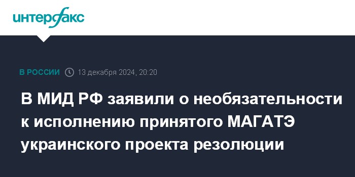 Москва. 13 декабря. INTERFAX.RU - В МИД РФ рассматривают принятый 12 декабря на внеочередной сессия Совета управляющих МАГАТЭ украинский проект резолюции "Последствия нестабильной энергетической инфраструктуры, имеющей критическое значение для безопасности и сохранности АЭС" как необязательный к исполнению государствами-членами организации.