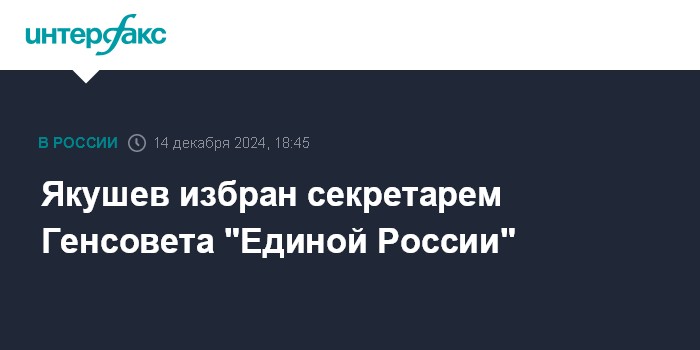 Москва. 14 декабря. INTERFAX.RU - Генеральный совет "Единой России" в субботу принял решение об избрании Владимира Якушева секретарем Генсовета партии. Решение принято в рамках работы 22-го съезда "Единой России".