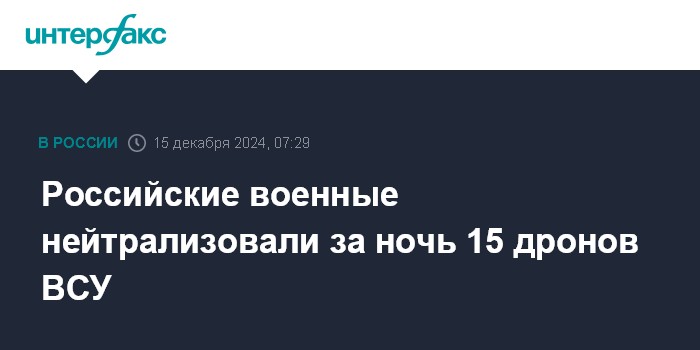Москва. 15 декабря. INTERFAX.RU - Российские военные в ночь на воскресенье уничтожили и перехватили 15 украинских дронов, сообщило Минобороны РФ.