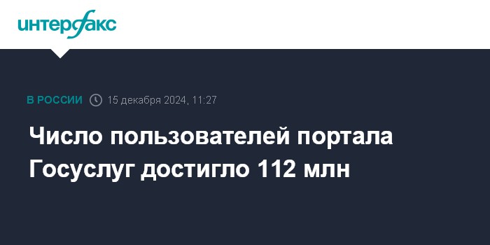 Москва. 15 декабря. INTERFAX.RU - Количество пользователей портала государственных и муниципальных услуг (Госуслуги) за 15 лет его работы достигло 112 млн, говорится в сообщении Минцифры России.