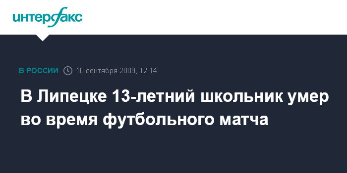 Москва. 10 сентября. INTERFAX.RU - Во время футбольного матча на стадионе школы N70 в Липецке умер 13-летний участник проходивших здесь в среду межшкольных соревнований.