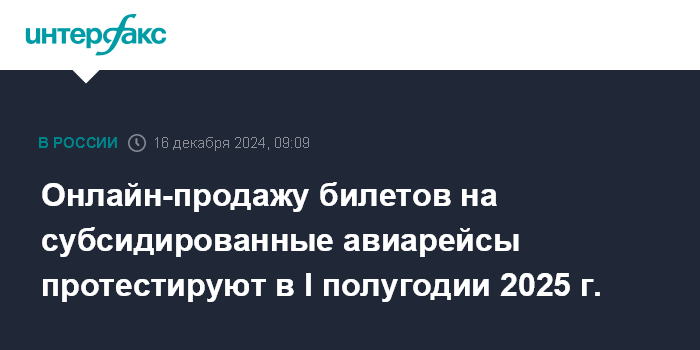 Москва. 16 декабря. INTERFAX.RU - Эксперимент по онлайн-продаже билетов на субсидированные авиаперевозки в РФ пройдет с 1 января по 1 июля 2025 года, сообщается на сайте правительства.