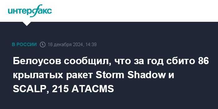 Москва. 16 декабря. INTERFAX.RU - Российскими средствами ПВО в 2024 году сбито 86 крылатых ракет Storm Shadow и SCALP, 215 баллистических ракет ATACMS, сообщил министр обороны РФ Андрей Белоусов в понедельник.