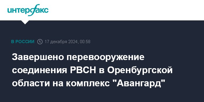 Москва. 17 декабря. INTERFAX.RU - Ракетные войска стратегического назначения (РВСН) России завершили перевооружение дивизии в Оренбургской области на новый ракетный комплекс "Авангард" с гиперзвуковым боевым блоком, сообщил командующий РВСН Сергей Каракаев.