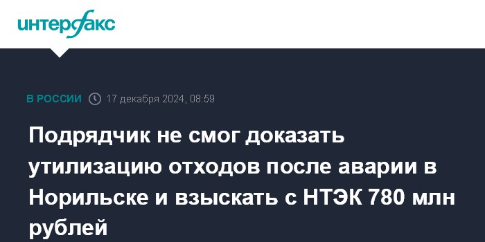 Подрядчик не смог доказать утилизацию отходов после аварии в Норильске и взыскать с НТЭК 780 млн рублей