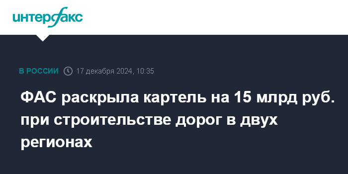ФАС раскрыла картель на 15 млрд руб. при строительстве дорог в двух регионах