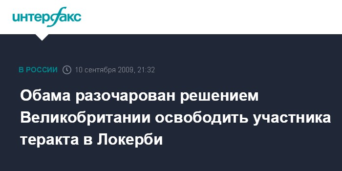 Москва. 10 сентября. INTERFAX.RU - Президент США Барак Обама в четверг в ходе телефонных переговоров с премьер-министром Великобритании Гордоном Брауном выразил недовольство по поводу решения британских властей освободить из тюрьмы ливийского террориста Абдельбасета аль-Меграхи. "Президент заявил, что разочарован этим решением шотландских властей", - говорится в коммюнике, опубликованном Белым домом.