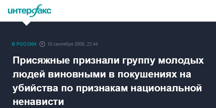 Москва. 10 сентября. ИНТЕРФАКС - Коллегия присяжных Мосгорсуда вынесла обвинительный вердикт банде молодых людей, обвиняемых в покушениях на убийства по признакам национальной ненависти.