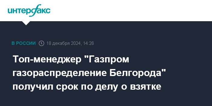 Москва. 18 декабря. INTERFAX.RU - В Белгородской области суд приговорил к реальному сроку замгендиректора по строительству и инвестициям АО "Газпром газораспределение Белгород", признанного виновным в получении взятки в особо крупном размере, сообщили в региональном управлении СКР.
