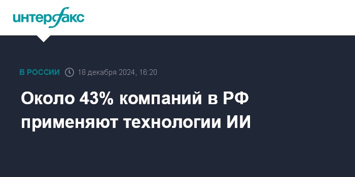 "С этого времени средний уровень использования ИИ-технологий в отраслях экономики и секторах социальной сферы увеличился в два раза. Порядка 43% организаций применяют его в своей деятельности",- сказано в сообщении.