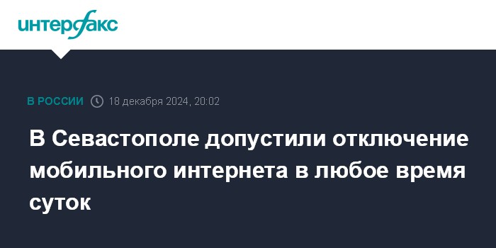 Москва. 18 декабря. INTERFAX.RU - Временные отключения мобильного интернета для обеспечения безопасности населения могут происходить в Севастополе в любое время суток. Об этом сообщил в своем телеграм-канале губернатор города Михаил Развожаев.