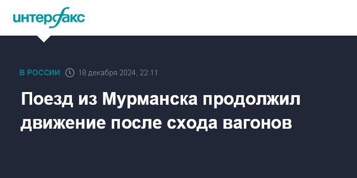 Москва. 18 декабря. INTERFAX.RU - Поезд Мурманск - Санкт-Петербург, три вагона которого сошли с рельсов в результате столкновения с грузовым составом на станции Княжая в Мурманской области в среду, продолжил движение, сообщила пресс-служба РЖД.