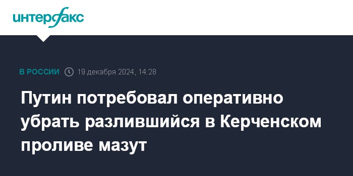 Москва. 19 декабря. INTERFAX.RU - Президент РФ Владимир Путин заявил, что нужно как можно скорее убрать разлившееся в Керченском проливе топливо, а также готовится к эвакуации оттуда танкеров.