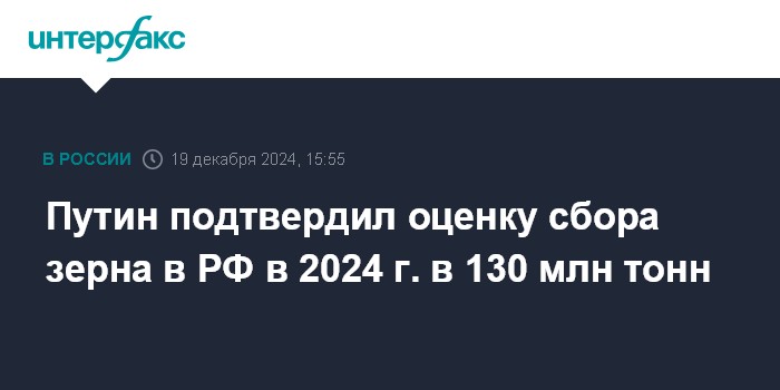 Москва. 19 декабря. INTERFAX.RU - Президент РФ Владимир Путин подтвердил прогноз сбора зерна в РФ в этом году в 130 млн тонн.