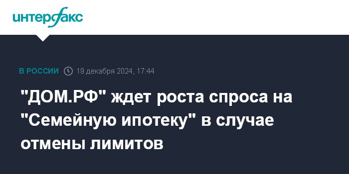 Москва. 19 декабря. INTERFAX.RU - Исключение из льготной программы "Семейная ипотека" механизма лимитов повысит ее востребованность, считают в "ДОМ.РФ".