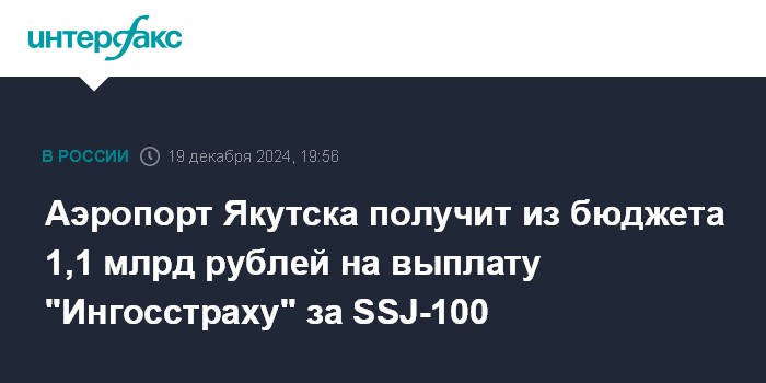 Москва. 19 декабря. INTERFAX.RU - Правительство Якутии предоставит из регионального бюджета 1,1 млрд рублей для исполнения аэропортом Якутска решения судов о выплате такой суммы в пользу СПАО "Ингосстрах" за повреждение самолета SSJ-100 в 2018 году.