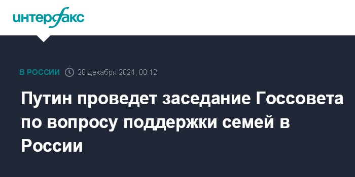 Москва. 20 декабря. INTERFAX.RU - Под председательством президента России Владимира Путина состоится заседание Государственного совета, которое будет посвящено вопросам поддержки семей в Российской Федерации, сообщает пресс-служба Кремля.