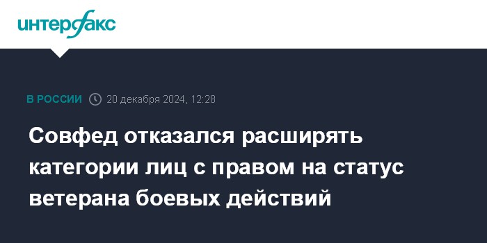 Москва. 20 декабря. INTERFAX.RU - Совет Федерации отклонил ранее принятый Госдумой закон, направленный на расширение категории лиц, которым может быть присвоен статус ветерана боевых действий.