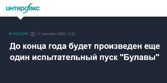 Москва. 11 сентября. INTERFAX.RU - Главком ВМФ РФ адмирал Владимир Высоцкий сообщил, что до конца года планируется осуществить очередной испытательный пуск межконтинентальной баллистической ракеты морского базирования "Булава". При этом Высоцкий опроверг сообщение о возможности переноса производства "Булавы" на другое предприятие.