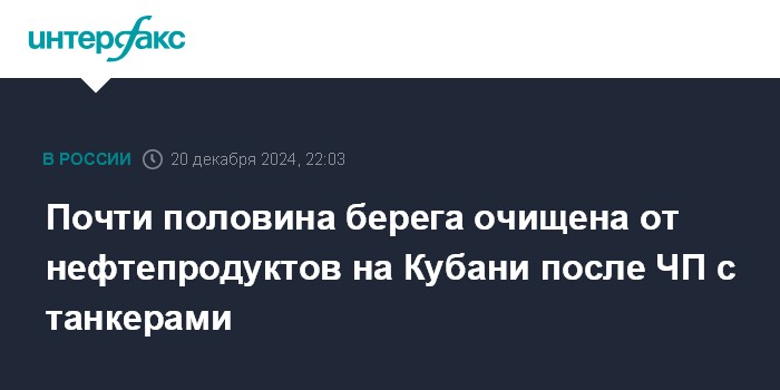 Москва. 20 декабря. INTERFAX.RU - Половина загрязненного после разлива топлива из-за крушения танкеров в Керченском проливе берега на черноморском побережье очищена, сообщает в пятницу оперативный штаб Краснодарского края.