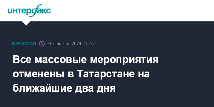 Москва. 21 декабря. INTERFAX.RU - Власти Татарстана отменили все массовые мероприятия в субботу и воскресенье из-за атаки БПЛА, сообщает пресс-служба главы Татарстана.