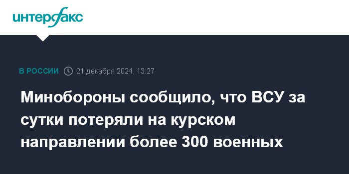 Москва. 21 декабря. INTERFAX.RU - Потери украинских войск на курском направлении за минувшие сутки составили более 300 военнослужащих, всего за время боевых действий противник потерял там до 42 750 человек, сообщило министерство обороны РФ в субботу.
