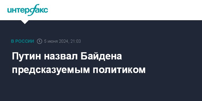 Москва. 5 июня. INTERFAX.RU - Президент РФ Владимир Путин вновь заявил, что, по его мнению, нынешний президент США Джо Байден является более предсказуемым политиком, чем Дональд Трамп.