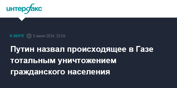Москва. 5 июня. INTERFAX.RU - Происходящее в секторе Газа в ответ на теракт в Израиле - это уничтожение гражданского населения, заявил президент РФ Владимир Путин.