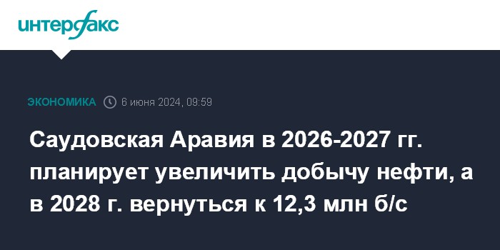 Саудовская Аравия в 2026-2027 гг. планирует увеличить добычу нефти, а в 2028 г. вернуться к 12,3 млн б/с