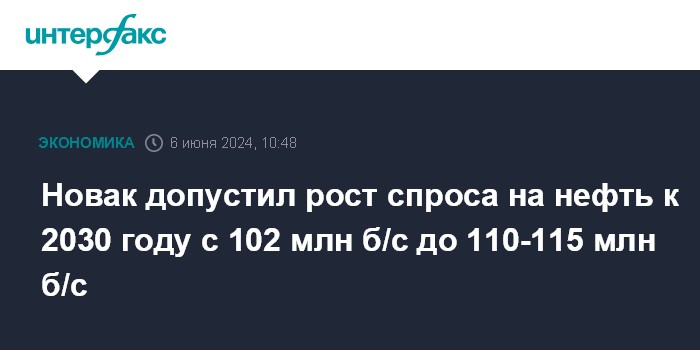 Москва. 6 июня. INTERFAX.RU - Спрос на нефть до 2030 года может вырасти с нынешних 102 млн баррелей нефти в сутки до 110-115 млн б/с, сообщил вице-премьер Александр Новак на сессии "Будущее рынка нефти и газа: перспективы глобального спроса и планы производителей" на ПМЭФ-2024.