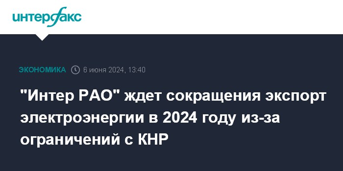 "Интер РАО" ждет сокращения экспорт электроэнергии в 2024 году из-за ограничений с КНР