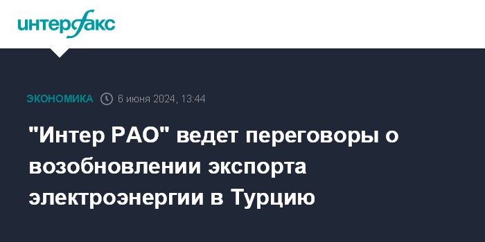 Москва. 6 июня. INTERFAX.RU - ПАО "Интер РАО" ведет переговоры о возобновлении экспорта электроэнергии в Турцию, сообщила журналистам в кулуарах ПМЭФ член правления компании Александра Панина.