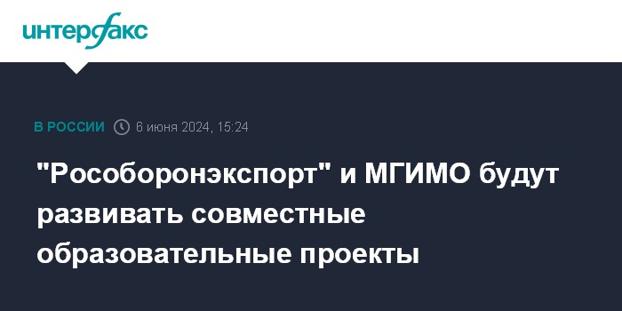 Москва. 6 июня. INTERFAX.RU - АО "Рособоронэкспорт" и Московский государственный институт международных отношений (университет) МГИМО заключили на полях ПМЭФ соглашение о сотрудничестве, сообщила пресс-служба "Рособоронэкспорта".