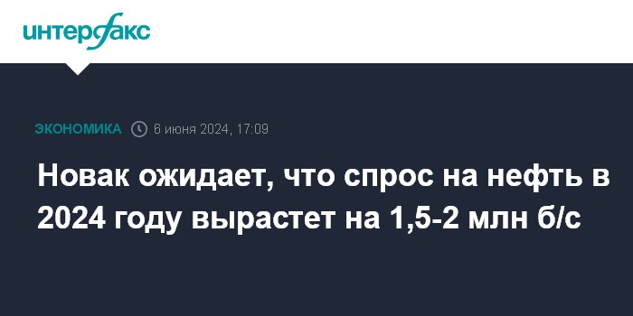 "Все сходятся к тому, что в 2024 году рост спроса составит 1,5-2 млн б/с, оценки роста спроса на следующий год ожидают рост в 1,5 млн б/с", - сказал он журналистам в кулуарах ПМЭФ.