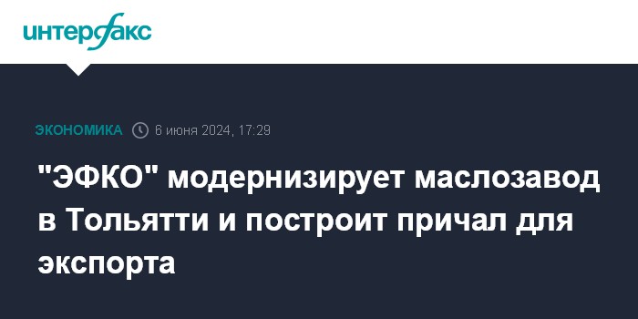 Москва. 6 июня. INTERFAX.RU - ГК "ЭФКО" реализует проект модернизации тольяттинского комбината пищевых продуктов, одного из крупнейших маслоэкстракционных заводов в РФ, построит причал для экспорта масла и шпрота по международному транспортному коридору "Север-Юг". Об этом сообщает пресс-служба регионального правительства в четверг.