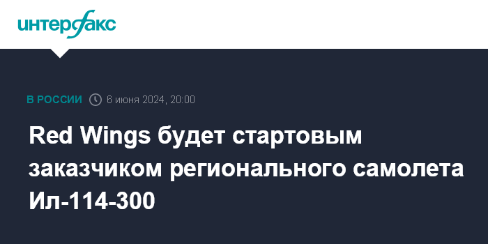 Москва. 6 июня. INTERFAX.RU - Авиакомпания Red Wings будет стартовым заказчиком регионального самолета Ил-114-300, заявил гендиректор ПАО "Объединенная авиастроительная корпорация" (ОАК, входит в "Ростех") Юрий Слюсарь.