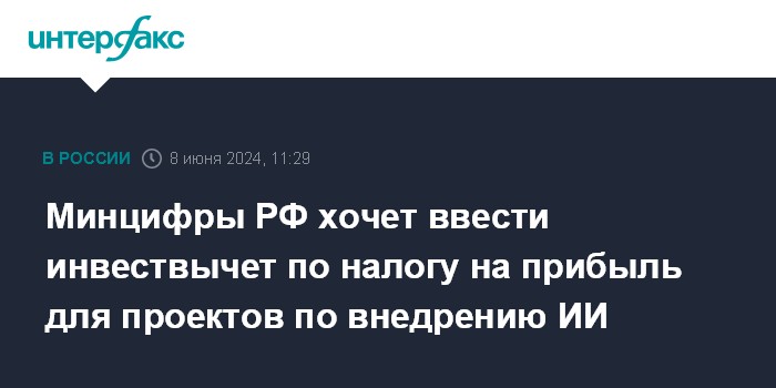 Москва. 8 июня. INTERFAX.RU - Минцифры РФ предлагает распространить федеральный инвестиционный налоговый вычет по налогу на прибыль на проекты по внедрению технологии искусственного интеллекта (ИИ), заявил глава министерства Максут Шадаев.