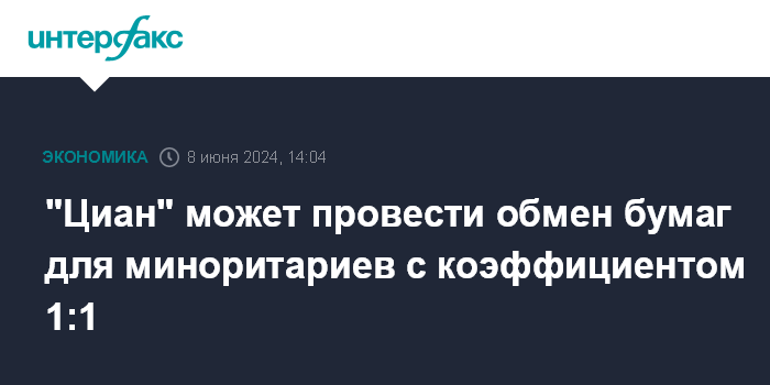 Москва. 8 июня. INTERFAX.RU - "Циан" может провести обмен бумаг для миноритариев холдинговой компании сервиса объявлений о недвижимости - кипрской Cian plc - с коэффициентом 1:1. При этом не исключено, что процесс обмена может распространиться на 2025 год.