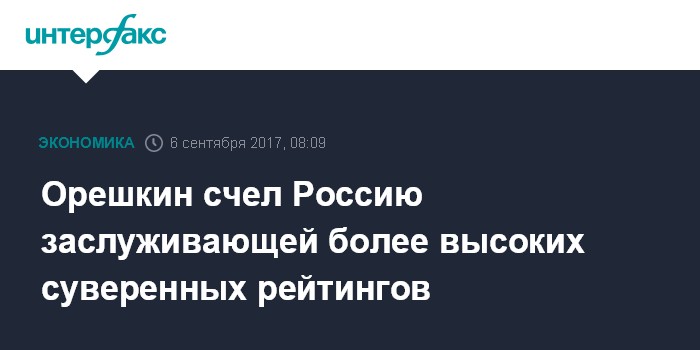 Москва. 6 сентября. INTERFAX.RU - Россия с текущим состоянием ее экономических показателей заслуживает более высоких суверенных рейтингов, чем имеет в данный момент, считает министр экономического развития РФ Максим Орешкин.