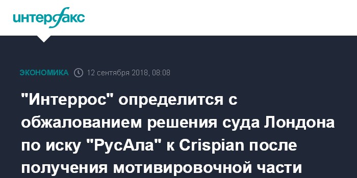 Москва. 12 сентября. INTERFAX.RU - "Интеррос" Владимира Потанина определится с вопросом обжалования решения лондонского суда по иску "РусАла" к Crispian после получения мотивировочной части, сказал "Интерфаксу" в кулуарах Восточного экономического форума вице-президент холдинга Андрей Бугров.