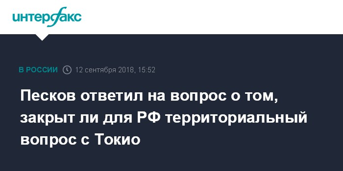 Москва. 12 сентября. INTERFAX.RU - Пресс-секретаря президента РФ Дмитрия Пескова спросили, закрыта ли для РФ проблема территориального спора с Японией, учитывая высказанное сегодня Владимиром Путиным предложение подписать с Токио мирный договор без предварительных условий.