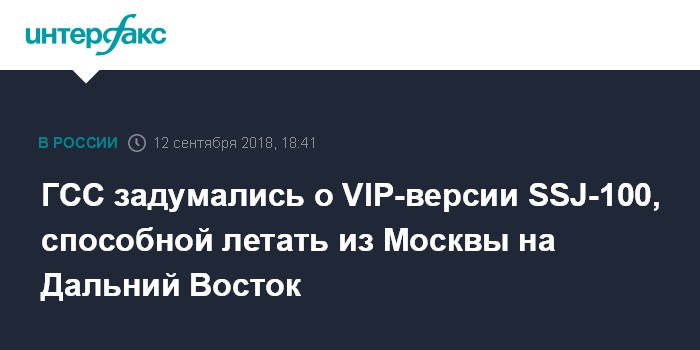 Москва. 12 сентября. INTERFAX.RU - АО "Гражданские самолеты Сухого" (ГСС) в 2019 году планирует выпустить бизнес-версию Sukhoi Superjet 100 (SBJ), способную преодолевать расстояние из Москвы на Дальний Восток.