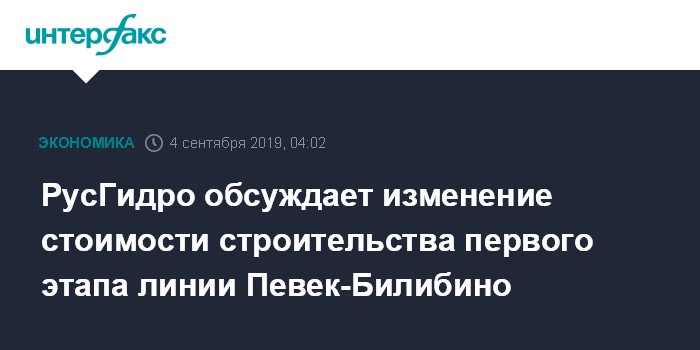 Москва. 4 сентября. INTERFAX.RU - ПАО "РусГидро" (MOEX: HYDR) обсуждает изменение стоимости строительства первого этапа линии электропередачи Певек-Билибино, сказал гендиректор "РусГидро" Николай Шульгинов журналистам в кулуарах Восточного экономического форума.