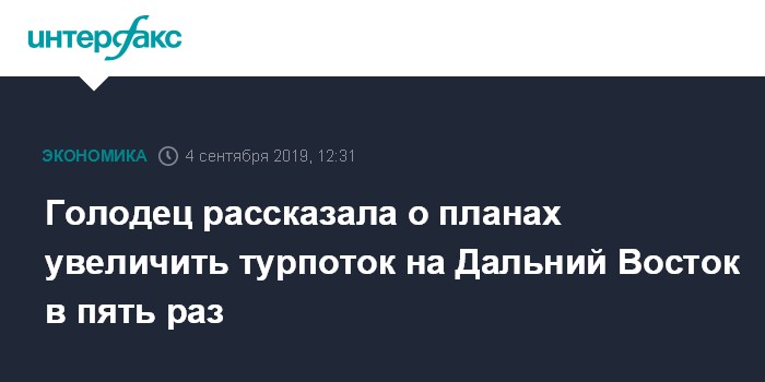 Москва. 4 сентября. INTERFAX.RU - Правительство России планирует увеличить турпоток на Дальний Восток в ближайшие годы в несколько раз, с этой целью введены электронные визы, выделяются средства из бюджета на программы развития туризма, сообщила вице-премьер Ольга Голодец на ВЭФ-2019.