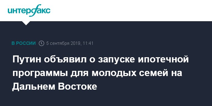 Москва. 5 сентября. INTERFAX.RU - Президент РФ Владимир Путин заявил, что поддерживает идею введения льготной ипотеки на жилье в регионах Дальнего Востока по ставке 2% годовых.