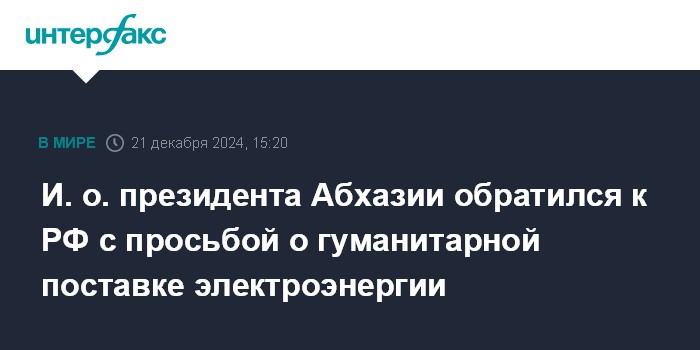 Москва. 21 декабря. INTERFAX.RU - Исполняющий обязанности президента Абхазии Бадра Гунба обратился к России с просьбой о гуманитарной поставке энергии республике, находящейся в кризисе.