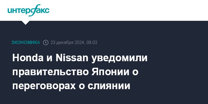 Москва. 23 декабря. INTERFAX.RU - Японские автопроизводители Honda Motor и Nissan Motor сообщили правительству Японии о планах начать переговоры о слиянии, сообщил Kyodo News источник в правительстве. Если переговоры завершатся успешно, будет создан третий по объемам продаж на мировом рынке автопроизводитель.